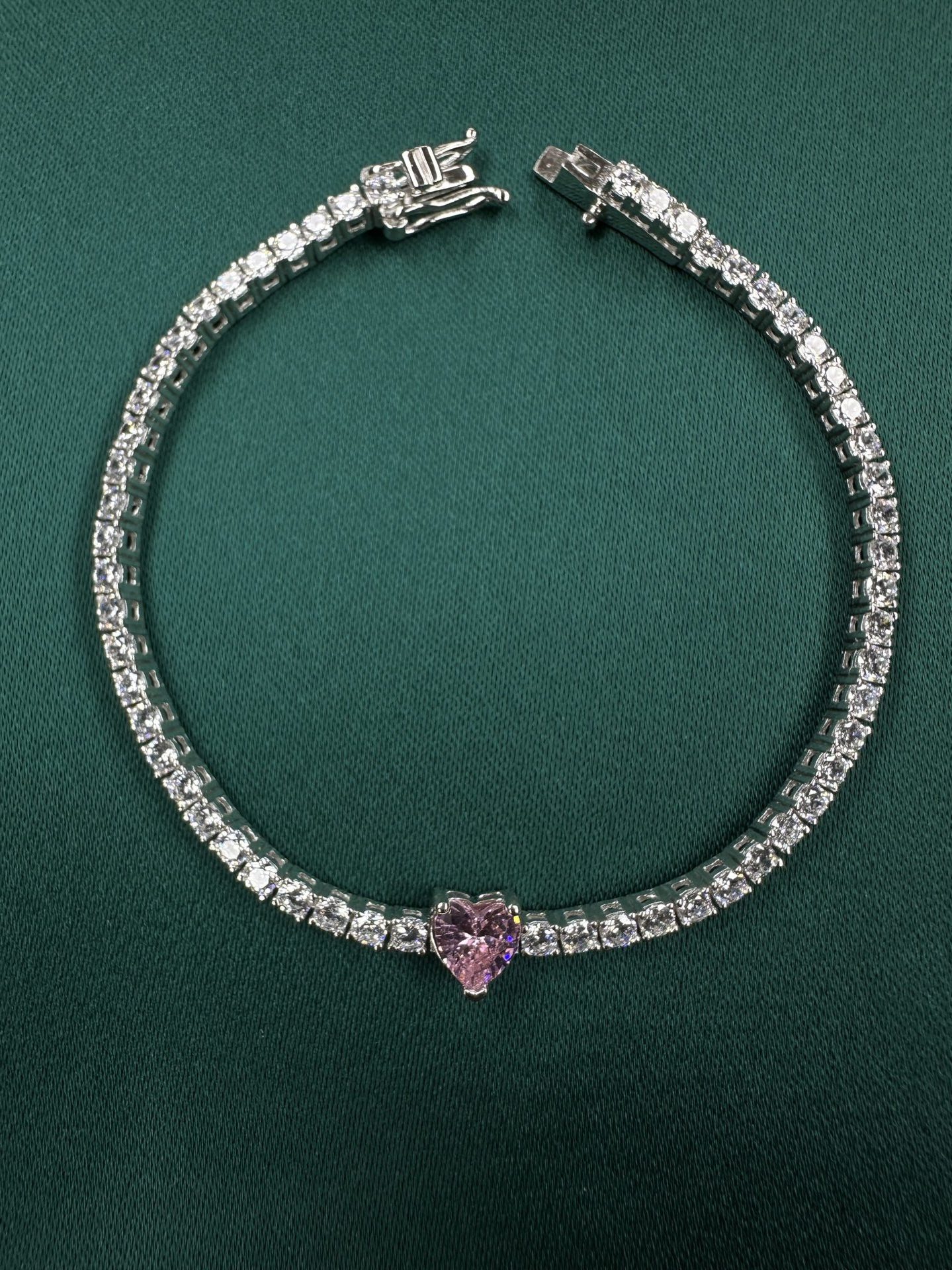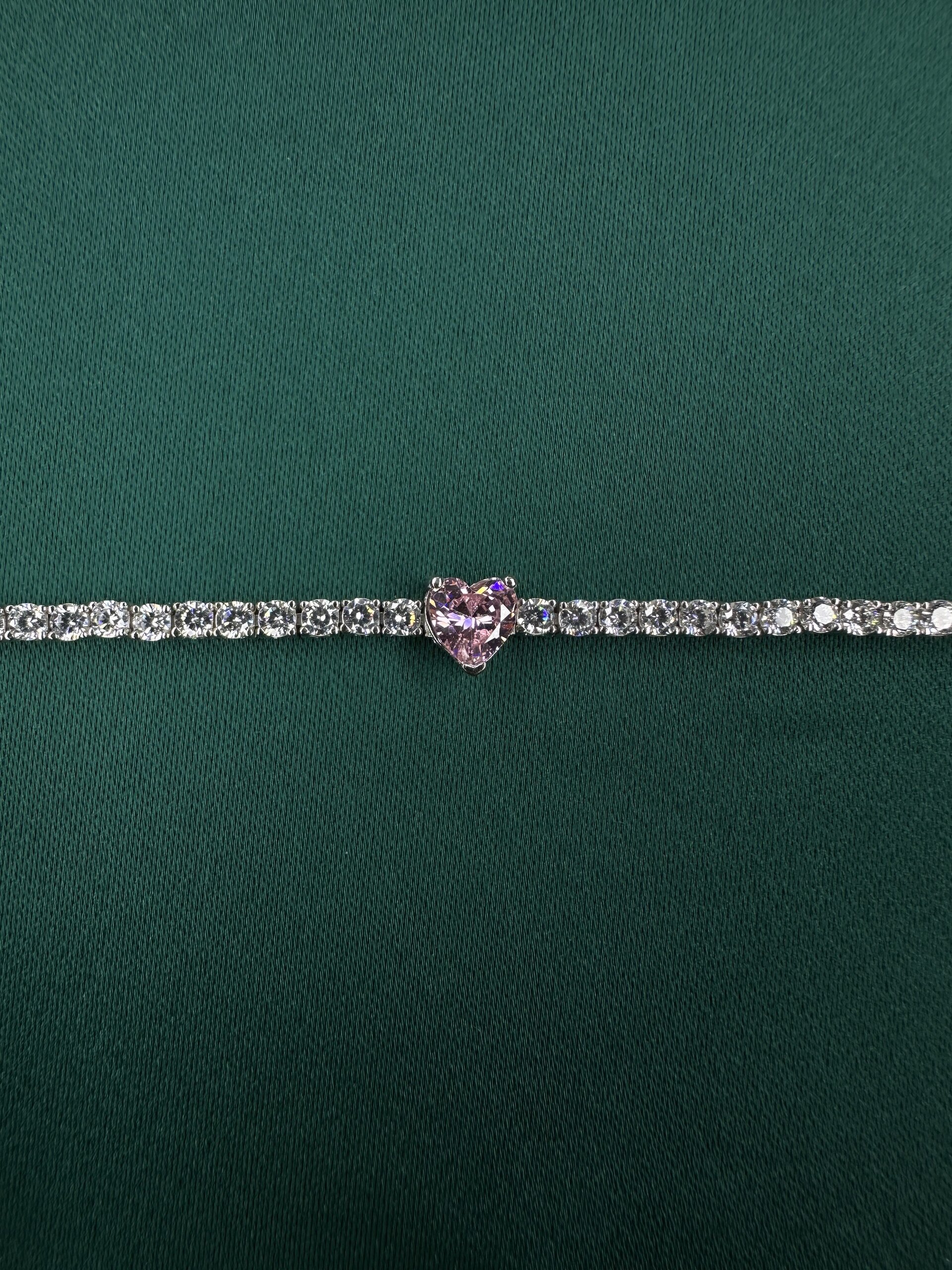 Kalbin en saf tonuyla parlayan bu tennis bileklik, tam ortasında yer alan pembe kalp kesim zirkon taşı ile göz alıcı bir romantizm sunar. Etrafını saran brilliant cut beyaz taş dizilimi, zarafeti tamamlayan bir klasik çizgi oluşturur.